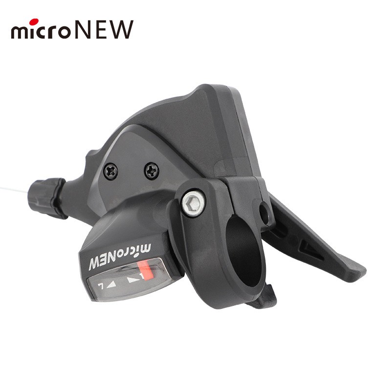Mando de cambio derecho micronew para bicicleta, diseñado para el cambio trasero y compatible con transmisiones de 7 velocidades. fabricado en plástico y acero, ofrece una estructura integrada, liviana y resistente, ideal para reemplazo, mantención o renovación del sistema de cambios. compatible con manubrios de 22,2 mm e incluye cable de cambio trasero.