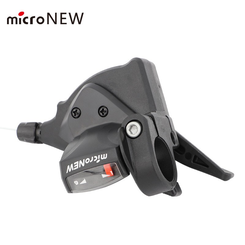 Mando de cambio derecho micronew para bicicleta, diseñado para el cambio trasero y compatible con transmisiones de 9 velocidades. fabricado en plástico y acero, ofrece una estructura integrada, liviana y resistente, ideal para reemplazo, mantención o renovación del sistema de cambios. compatible con manubrios de 22,2 mm e incluye cable de cambio trasero.